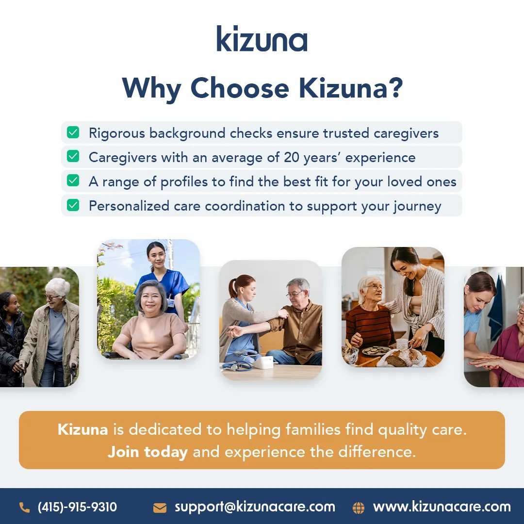 Choose Kizuna for quality caregiving tailored to your family. Our caregivers undergo rigorous background checks and bring years of experience to every role. Enjoy personalized care coordination and unmatched support from start to finish. Join Kizuna and experience the difference today.